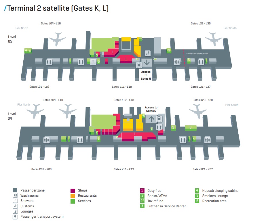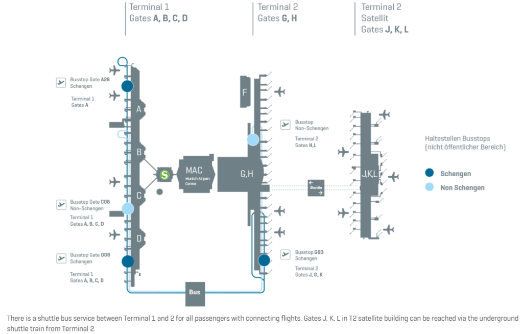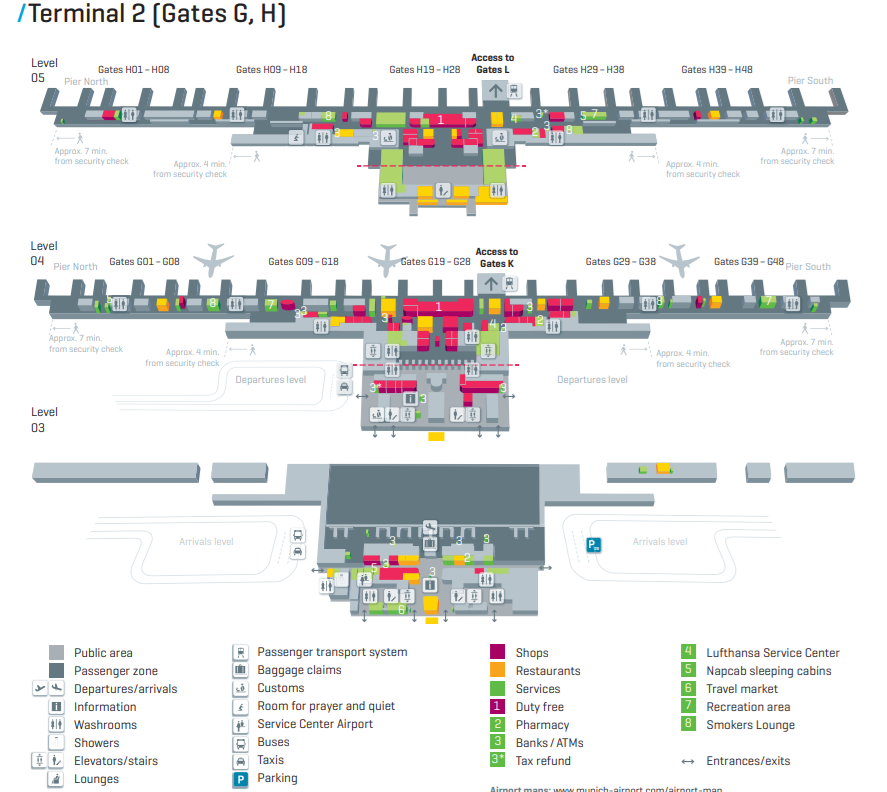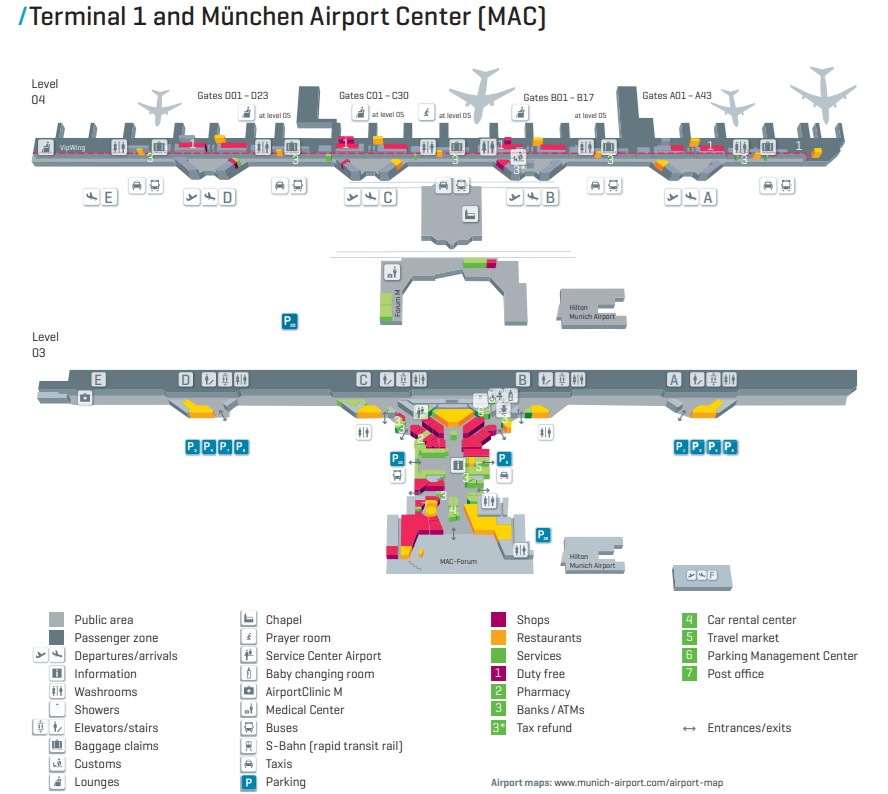 ミュンヘン空港のターミナル1、ターミナル2のマップは以下の通りです。